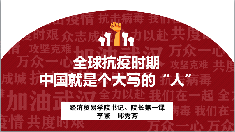 “全球抗疫,大战大考,中国在此期间体现出了什么样的品质?目前的世界形势,中国的机遇和挑战在哪里?作为青年大学生,我们应该有什么样的担当?”一系列的问题,在本学期经贸学院书记、院长思政第一课上展开了热烈的讨论。这是经贸学院史上第一次线上思政第一课,第一次书记、院长同上一节思政课,两个史上第一让这次的云课堂充满了新鲜和期待。