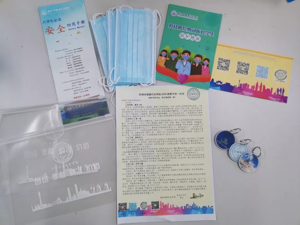 今年测绘学院给每位新生精心设计和制作大礼包一份,内含;1、入学启蒙.测绘学院院长书记给新生的一封信及思政第一课;2、知识装载.测绘考试专用笔袋3、开启未来.测绘学院专用钥匙扣4、健康守护.防护口罩、5、安全保护.防范手册,防疫手册6、联系你我.新生联系卡片。