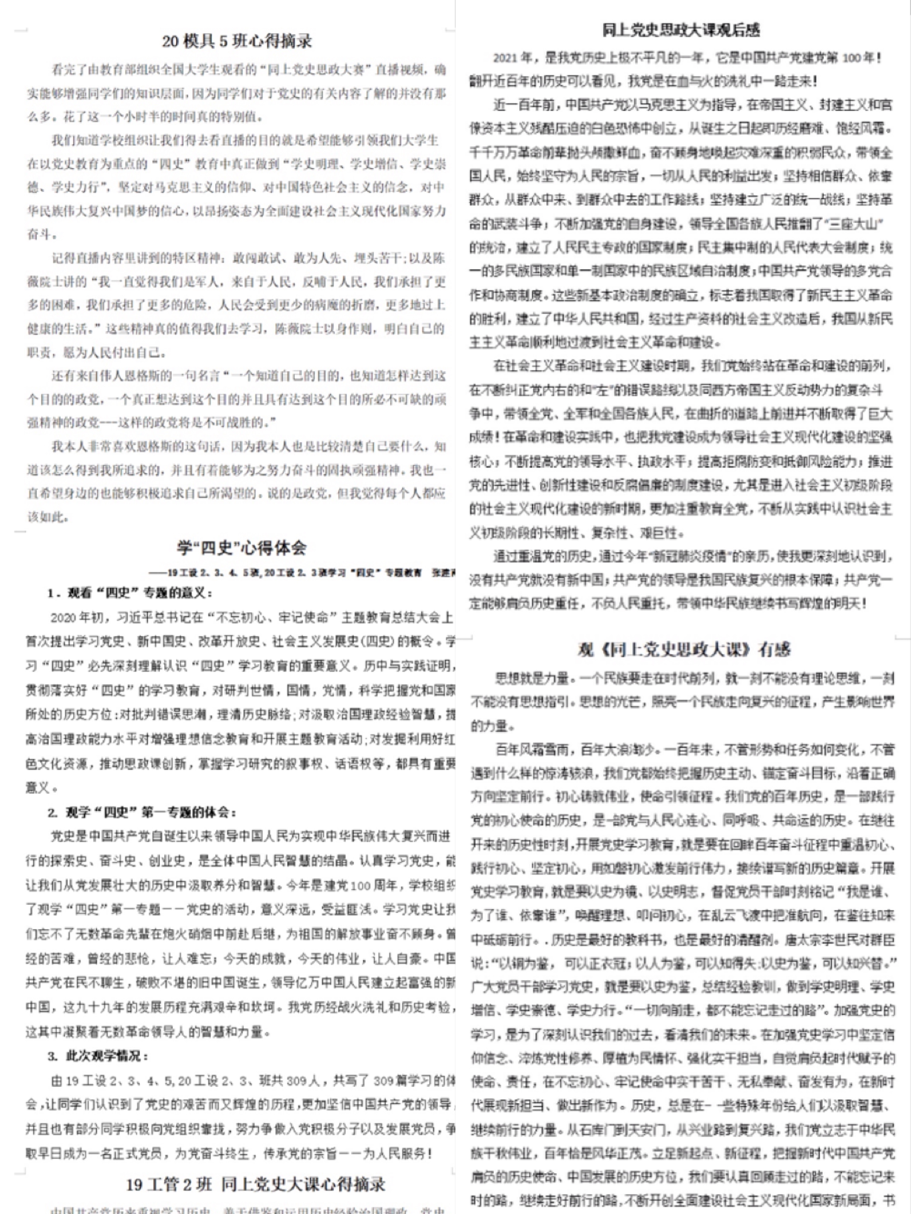 在这堂大课中,北京师范大学赵朝峰教授、武汉大学卢勇副教授、南京航空航天大学何畏教授三位专家分别以“马克思主义与中国共产党的百年辉煌”、“中国共产党与中华民族的伟大复兴”、“中国共产党革命精神形成与传承的百年历程”为题,带领我们回顾了中国共产党的百年奋斗历程,并从不同的视角清晰梳理了党的发展脉络。这堂思政大课的内容紧密结合党史学习教育,主题鲜明、内涵深刻、讲解生动、富有启发性,为我们带来了一场既精彩又震撼的精神盛宴。历史已经充分证明,没有先进理论的指导,没有先进政党的领导,中华民族就无法实现从站起来、富起来、强起来的伟大飞跃。历史是最好的教科书,也是最好的营养剂,通过学习,广大青年学生对党的历史有了进一步的认识,更加坚定了跟党走的信心和决心。九十分钟的课程让同学们受益匪浅,大家围绕党史学习写下了自己的学习心得和体会。同学们纷纷表示,这堂思政大课让他们深刻认识到了一个强有力的领导核心对于党和国家事业的重要性,从而更加坚定了对马克思主义的信仰、对中国特色社会主义的信念、对中华民族伟大复兴中国梦的信心。作为新时代青年,一定要自觉传承红色基因,刻苦学习、勇于担当,真正将“四史”思政大课的教育意义内化于心、外化于行。