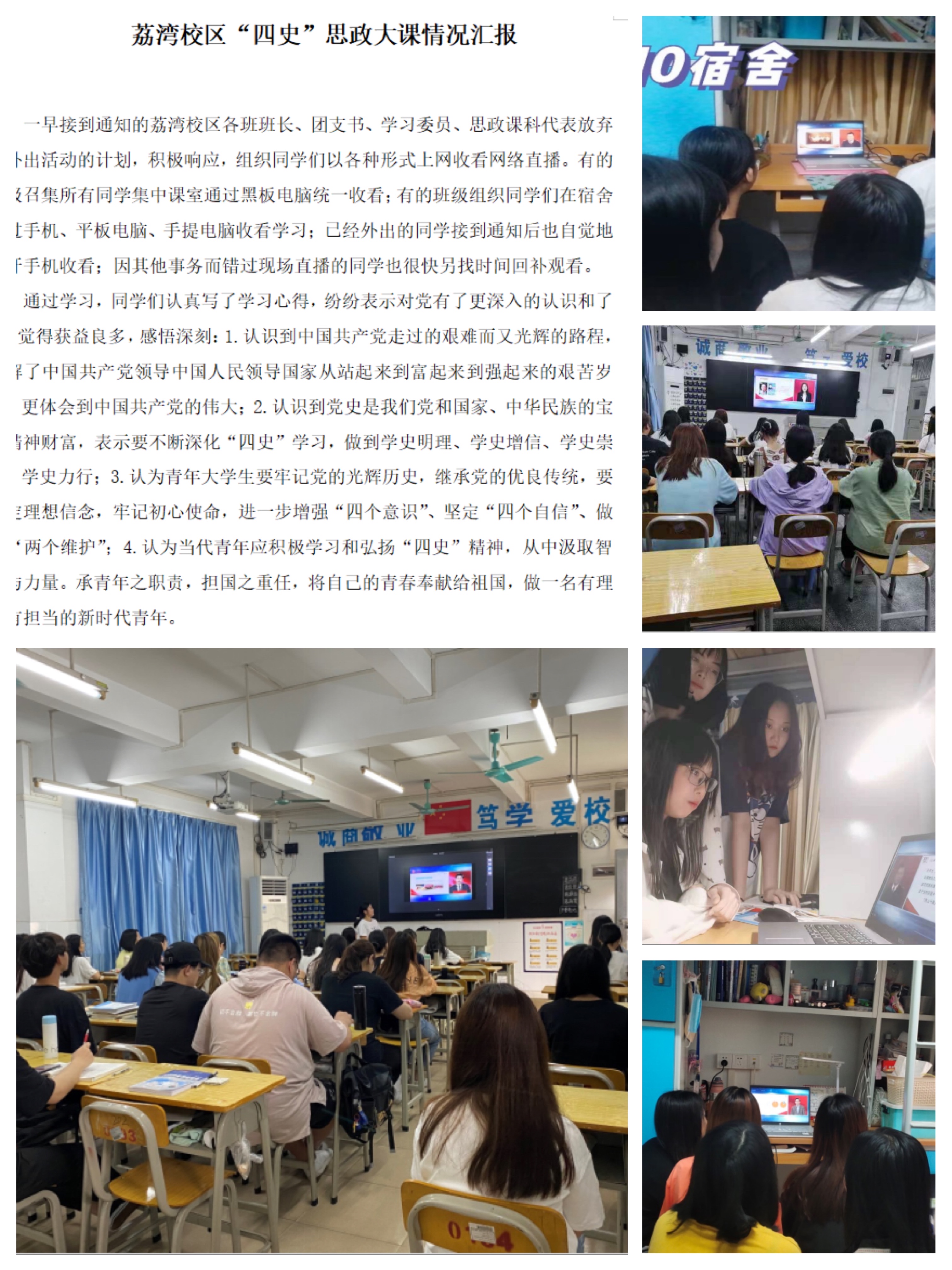 为深入贯彻落实习近平总书记在党史学习教育动员大会上的重要讲话精神,引导广大青年学生做到学史明理、学史增信、学史崇德、学史力行,根据《教育部社科司关于组织全国大学生“同上‘四史’思政大课”的通知》,马克思主义学院在4月24日组织学生在线收看了“同上‘四史’思政大课”的第一堂课——“同上党史思政大课”,并积极分享了学习感受。