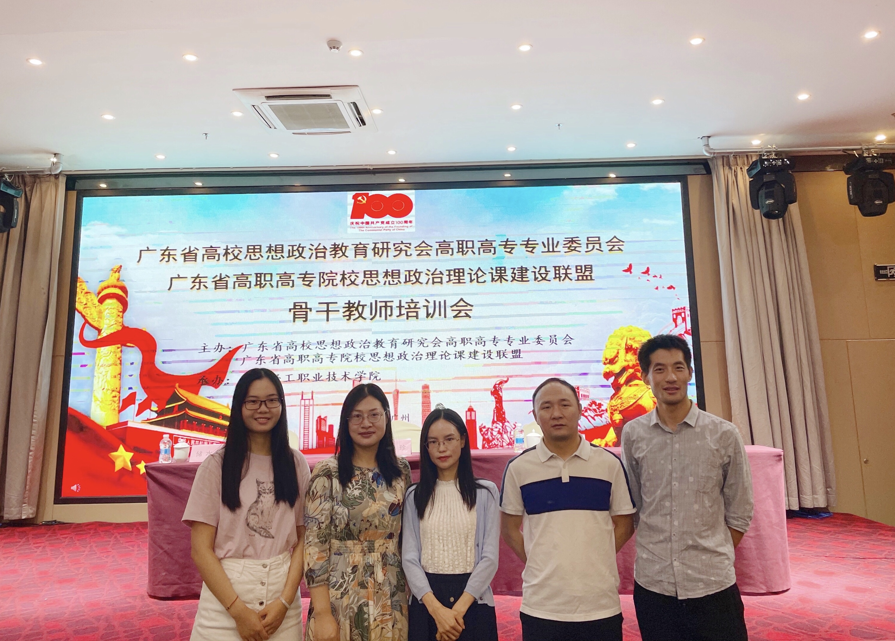 为庆祝中国共产党成立100周年,学习贯彻习近平总书记在党史学习教育动员大会上的重要讲话精神,提高思政课教师队伍建设,广东省高职高专思想政治建设联盟于4月24-25日在广州轰谧斯宾馆举办了2021年度高职院校思政课骨干教师培训会议,威尼斯官网马克思主义学院晏意华、毛玲、李静、蔡乙华、赵勇敢四位老师参加了会议。