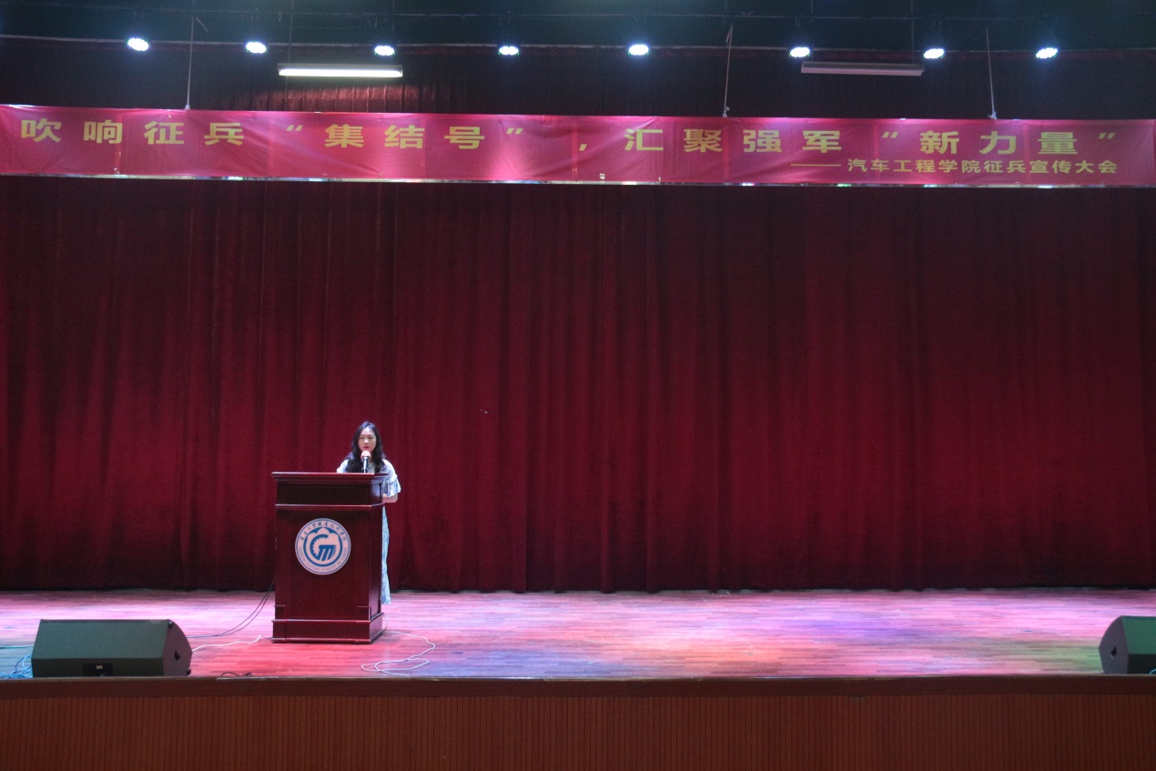 为切实做好2021届毕业生的就业和征兵工作,汽车工程学院于5月13日在明德楼演艺厅举行2021届毕业生大会暨“吹响征兵集结号,汇聚强军新力量”主题征兵宣传会。副校长唐毓秋、院长王艳芬、副院长潘梦鹞、党总支副书记欧敏出席,学院辅导员及全体毕业生参加了本次大会。会议由党总支副书记欧敏主持。