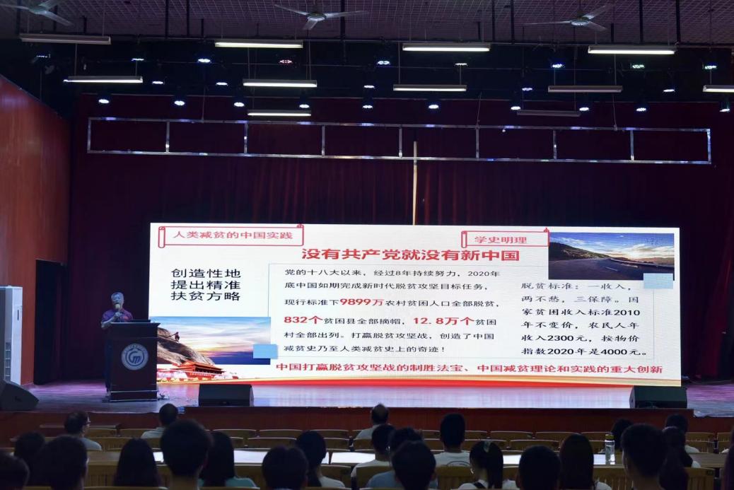 讲座上,彭教授以“中国共产党为什么能?”这一问题展开,从学史明理、学史增信、学史崇德、学史力行四个方面向同学们介绍了《人类减贫的中国实践》白皮书。回顾了100年来中国共产党团结带领人民与贫困作斗争,特别是党的十八大以来,习近平总书记亲自指挥、亲自部署、亲自督战,汇聚全党全国全社会之力打赢脱贫攻坚战的波澜壮阔伟大历程。同时,彭教授详细讲述了自己在雷州那毛村5年以来精准扶贫的心路历程,介绍如何从最初那毛村贫、脏、老的村情村况,通过贯彻落实党和政府政策,从“扶志”、“扶智”、“扶技”等方面带活一个个产业和带富一方农户,发展到现如今已是享誉省内外的宜居新村,阐述了当代扶贫工作者的初心与使命、担当与情怀。