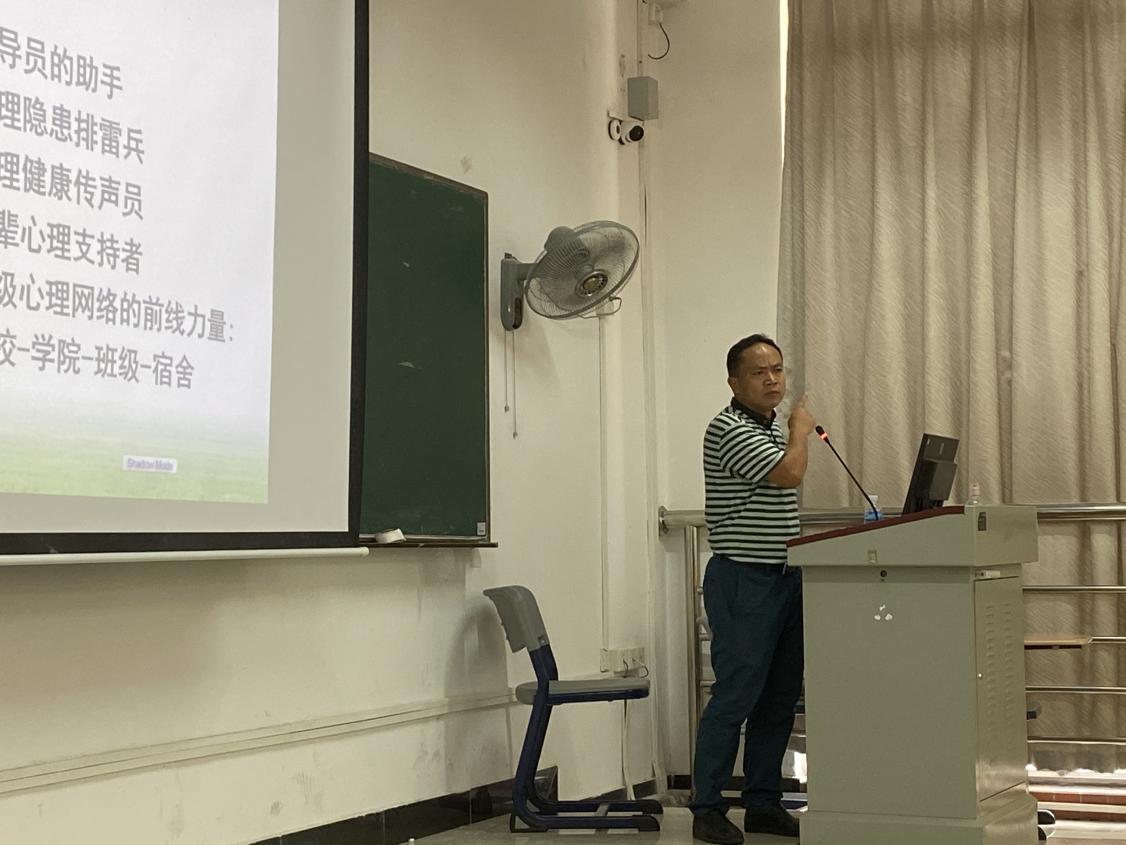 在培训中,龚伟志首先从“心理委员的职能是什么”的问题出发,让心理委员们思考以及发现在校园里,同学们在生活或者心理上会出现什么样的问题。龚老师再用浅显易懂的教法为心理委员们解答疑惑。让同学们更加明白了心理委员要做什么,怎么做?他还就“需要特别关注的同学”展开了危机干预的深入讨论。希望大家能够掌握好这些方法,筛选身边需要帮助和陪伴的同学。接着龚老师对“‘5.25’大学生心理健康系列比赛”活动作了详细的说明并鼓励同学们积极参加。