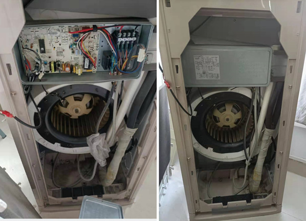 劳动成果展示:空调内部处理前后对比(处理前:电路盖板掉落,内部卷入塑料袋)