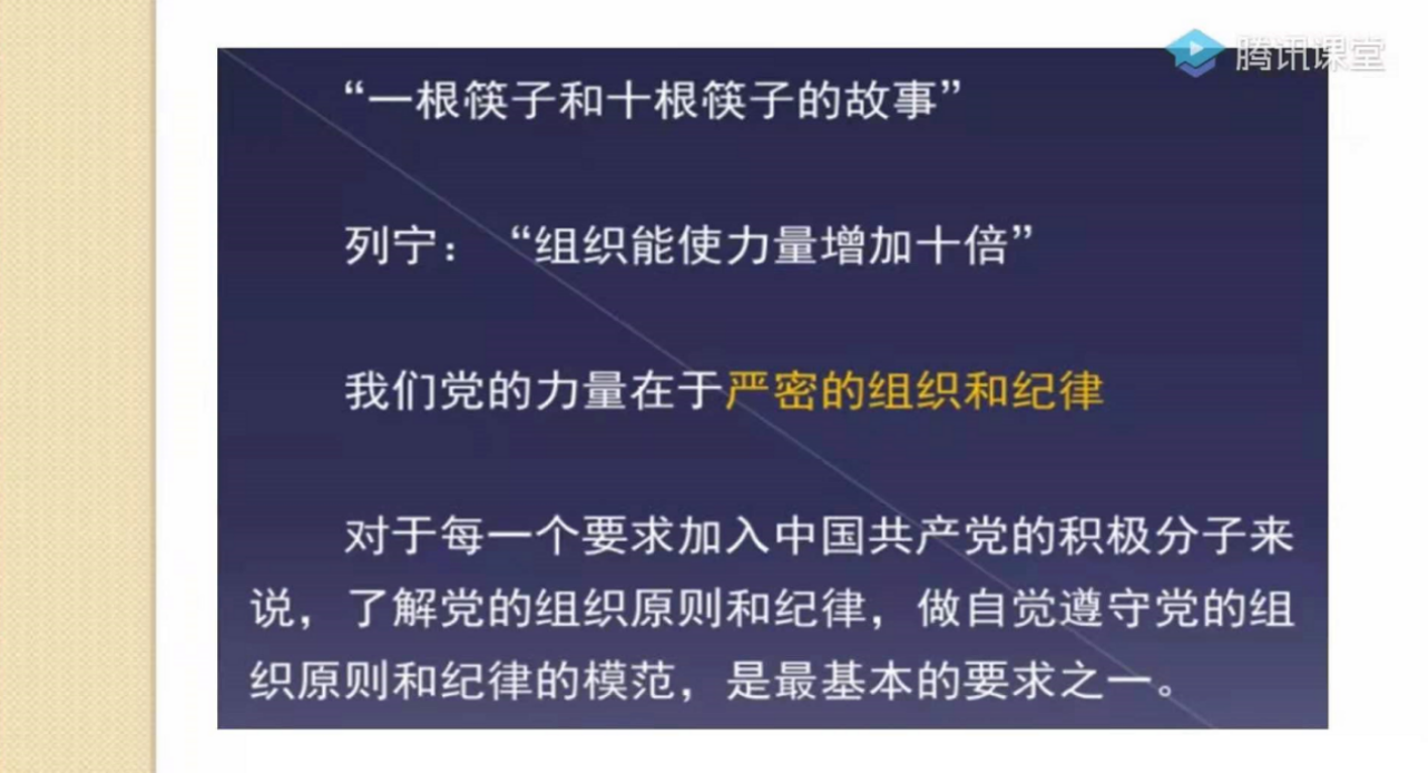龚云首先从“一根筷子和十根筷子的故事”引出党的力量在于严密的组织和纪律,要求各位入党积极分子要了解和遵守党的组织原则和纪律。通过介绍党的纪律的含义、内容、特点,强调了入党积极分子必须增强纪律意识和法治观念。最后龚云号召广大学员自觉抵制腐败,保持与时俱进、奋发有为的精神状态,做到政治上清醒、工作上勤奋、作风上朴素、生活上廉洁。