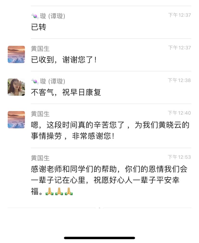“一方有难,八方支援。”得知黄晓云同学患病的消息后,我院2021年4月12日组织动员,发起爱心募捐。全校师生纷纷响应,伸出援助之手,慷慨解囊,奉献出自己的一片爱心,共同谱写一曲爱的乐章。截至目前共收到全校师生捐款27982.57元,学院已把募捐到的钱转到黄晓云父亲账号并表示关怀及慰问,祝愿黄晓云同学能早日康复,重返校园!