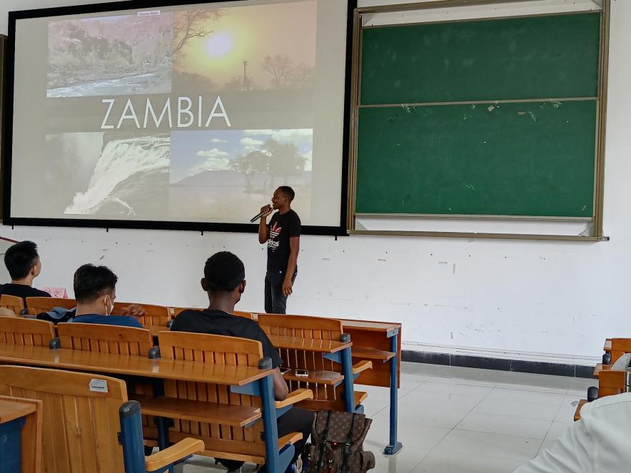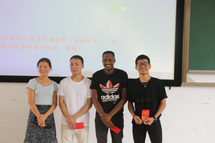 本次活动还邀请了目前正在我们学校机电学院学习的来自赞比亚、印度尼西亚和吉尔吉斯斯坦的留学生来到比赛现场。留学生代表麦星泽(Michael)、安德烈(Andrea)、刘浩(Elaman)同学也为我们带来了精彩的PPT演示,向我们介绍了他们的国家的风景、民俗等国外文化。在他们演讲结束后,肖铁蕾老师亲切地送了他们具有中国特色的“红包”作为纪念品。