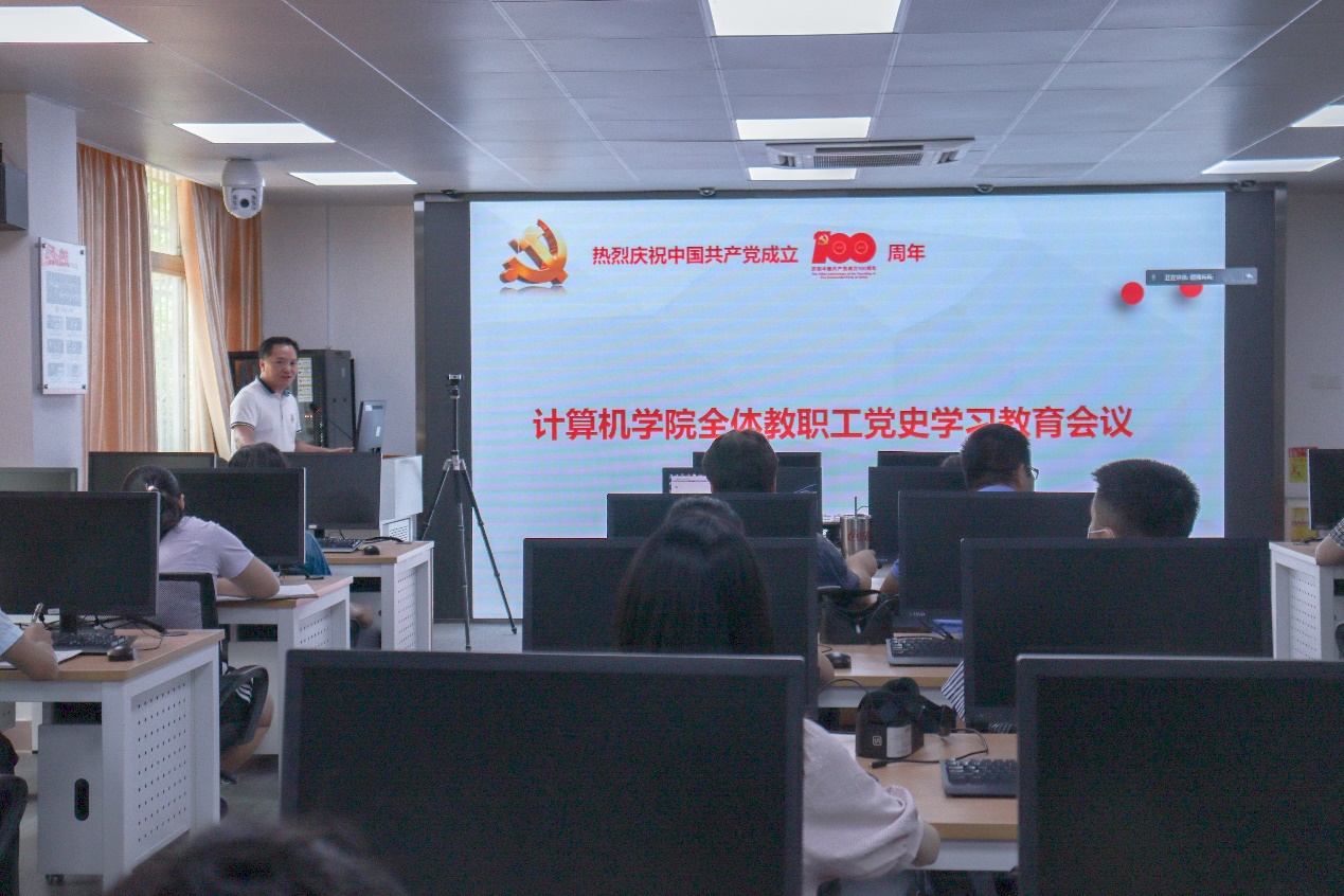 根据学校党史学习教育的部署,计算机与信息工程学院六月十五日下午在实训楼202课室举行全院教职工党史学习教育会议,本次会议的主题是“永远跟党走,让党旗高高飘扬”。会议由学院党总支书记张宁主持,全院教职工参与了会议。因疫情防控原因,会议线上线下同时进行。