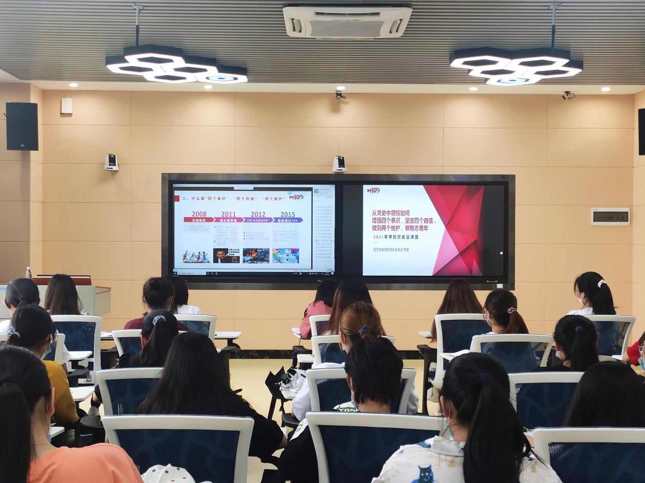 6月22日下午2点15分学院党总支李繁书记通过直播的方式在腾讯课堂给经济贸易学院学生党员开展了以《从党史中领悟如何增强“四个意识”、坚定“四个自信”、做到“两个维护”,做有志青年》为主题的党史学习教育专题党课,分别从:什么是“四个意识”、“四个自信”、“两个维护”,为什么要增强“四个意识”、坚定“四个自信”、做到“两个维护”和“四个意识”、“四个自信”、“两个维护”的意义等几个方面召开学习探讨。
