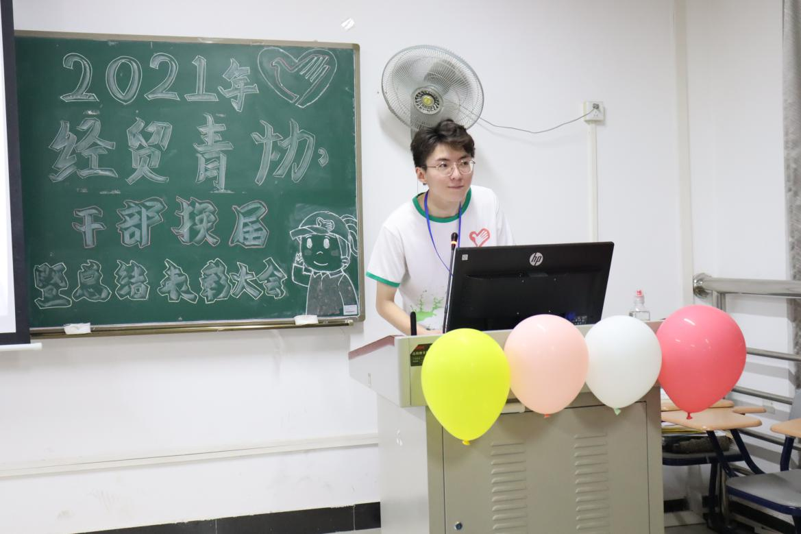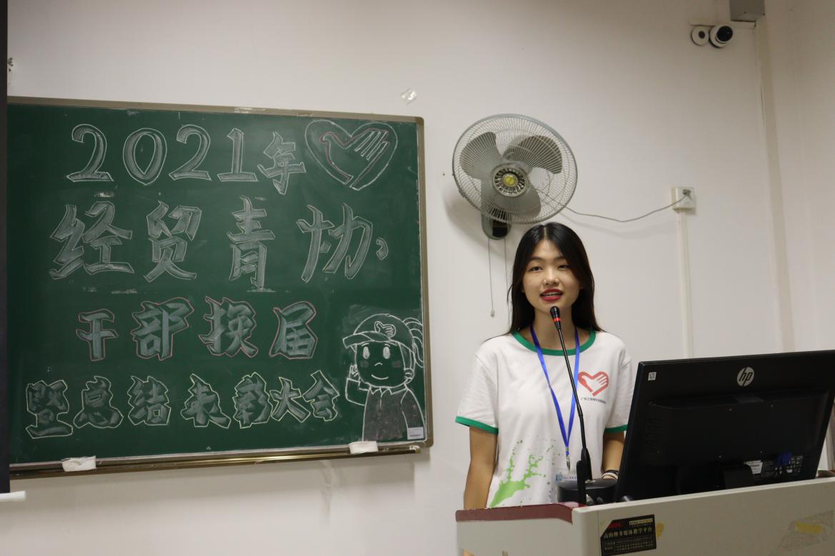 首先主持人郑远海介绍到场嘉宾,随后19级副会长黄文燕作工作总结,2020-2021年经贸青协共计开展志愿活动57项,参加志愿活动人数达2843人,累计志愿时76509.98小时。同时对新任一届干部和干事的近期工作提出建议,向更好的道路发展。