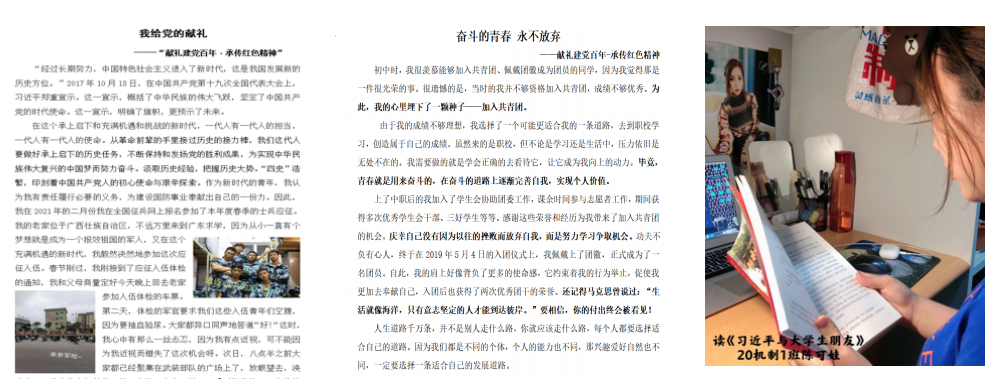 此次活动作品内容要求紧扣“献礼建党百年 承传红色精神”主题,结合个人学习党史过程中的思想感受、心得体会和行为转变,讲述感人至深的故事,抒发火热真挚的情感,表达对奋进新征程、勇担时代使命的信心和决心。经学生本人提交、所在班级思政课教师择优推荐,马院共收到推优作品共计239篇。结合推优情况和建党百年实际,经过马院直属党支部支委扩大会议讨论和评审,目前已评选出获奖作品100篇,其中一等奖12篇,二等奖20篇,三等奖30篇,优秀奖38篇,获奖学生将获得荣誉证书和相应的奖金。