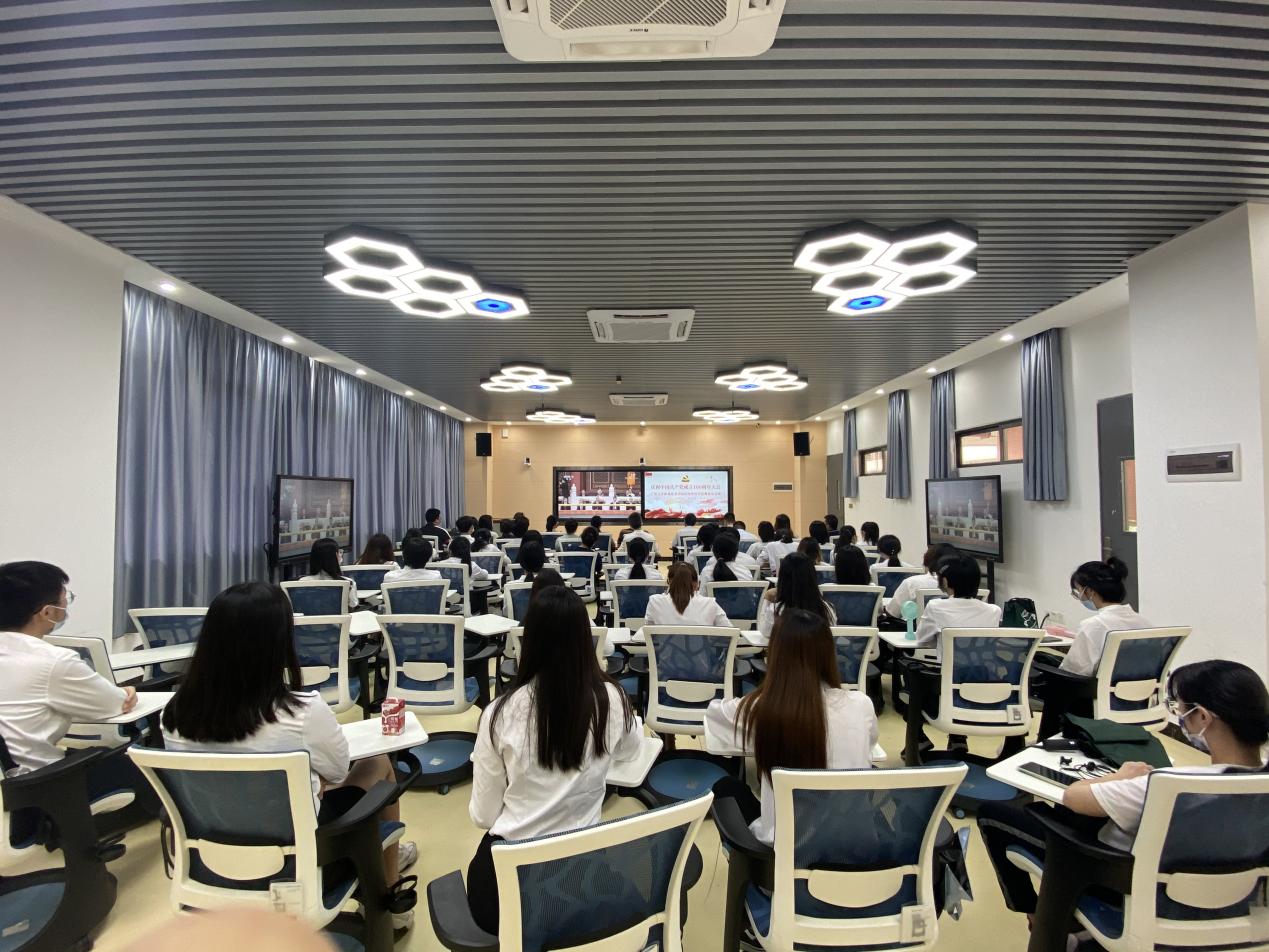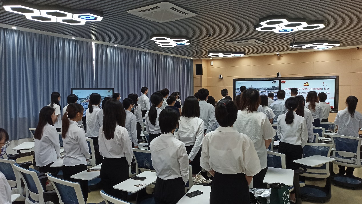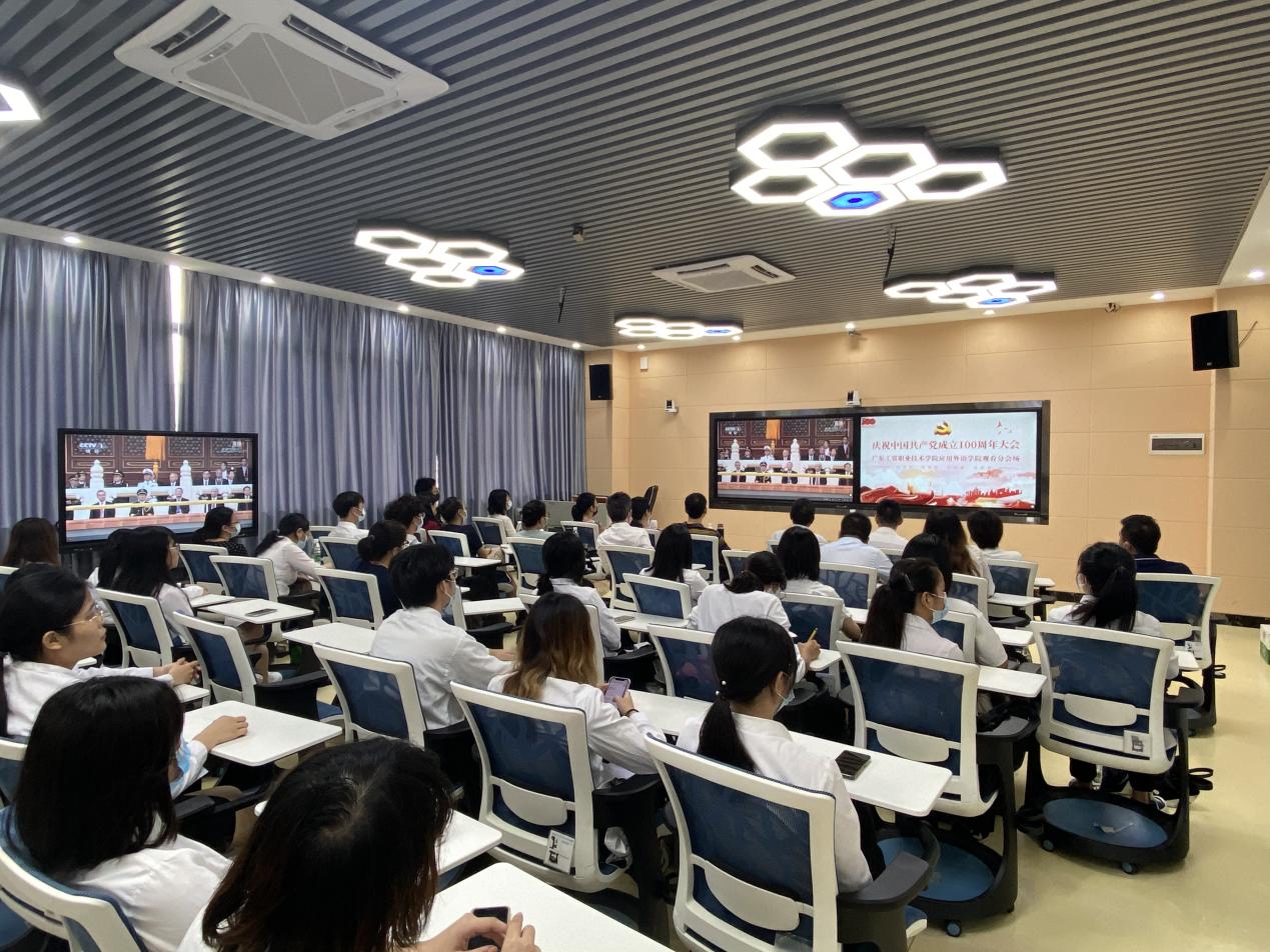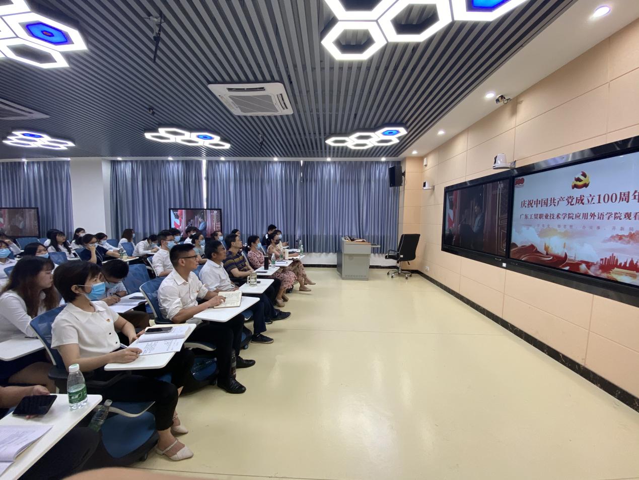 为庆祝中国共产党百年华诞,根据《关于收听收看庆祝中国共产党成立100周年大会暨召开学习座谈会的通知》(粤工贸院教办【2021】11号)要求,7月1日上午8时,应用外语学院党总支组织学院党政领导班子及全体师生党员60人于明德楼1区316集体收看庆祝中国共产党100周年大会盛况直播,聆听习近平总书记重要讲话,亲身感知、感受庆祝建党100周年的浓厚氛围。