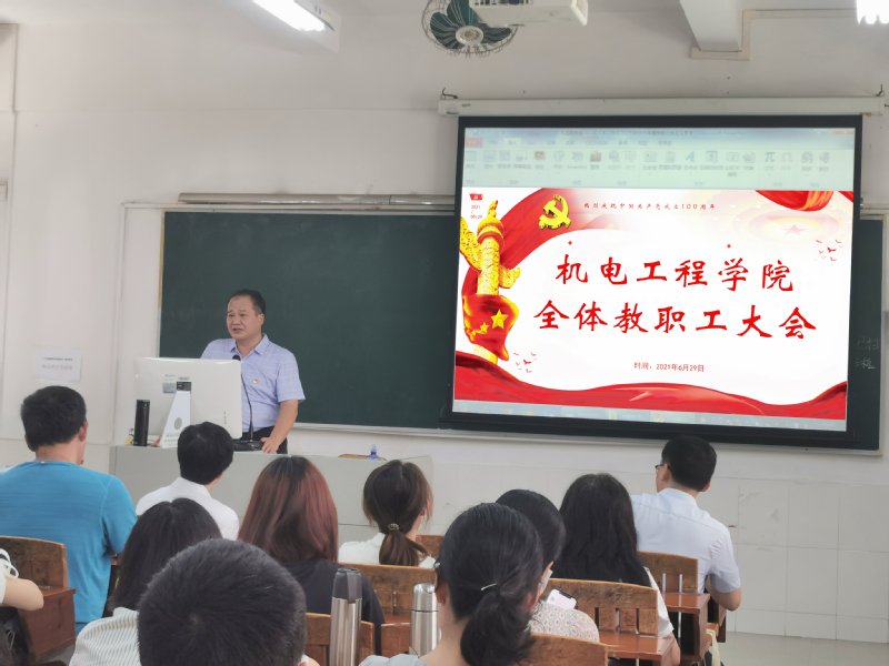 6月29日,机电工程学院于天河校区教学楼202课室召开了全体教职工会议。机电工程学院领导班子及全体教师参加会议,会议由机电工程学院党总支书记邵超城主持。