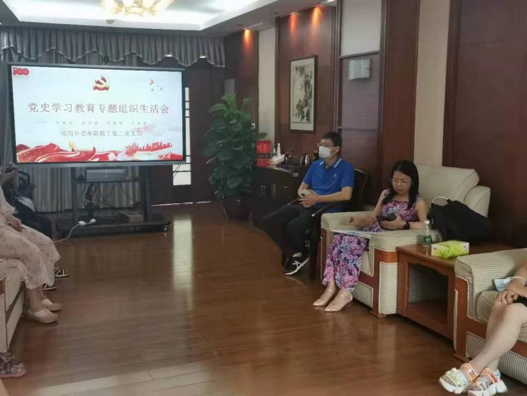 为深入贯彻习近平总书记在庆祝中国共产党成立100周年大会上的重要讲话精神,进一步加强党史学习教育促使我院教师党员牢固树立“四个意识”、坚定“四个自信”以及坚决做到“两个维护”,7月6日下午,应用外语学院教工第二党支部于天河校区接待室召开了党史学习专题组织生活会。会议由支部书记彭枚芳主持。