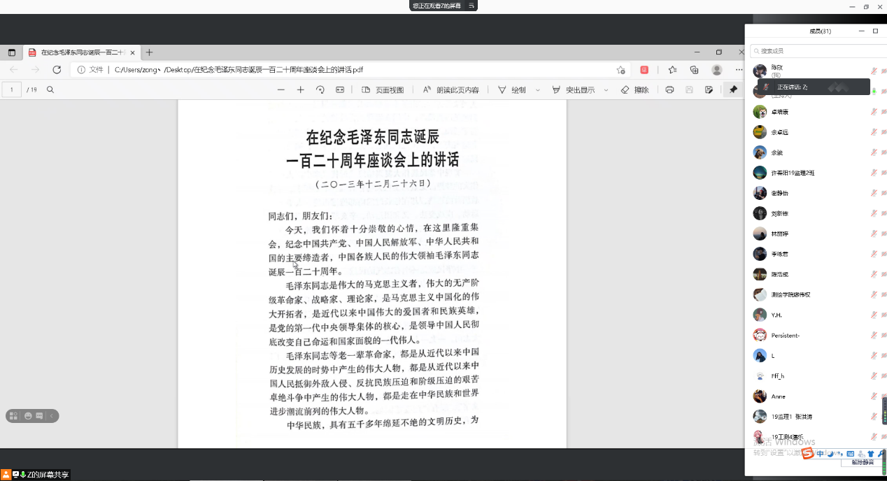 学生党员曾旭仕领学《在纪念毛泽东同志诞辰一百二十周年座谈会上的讲话》