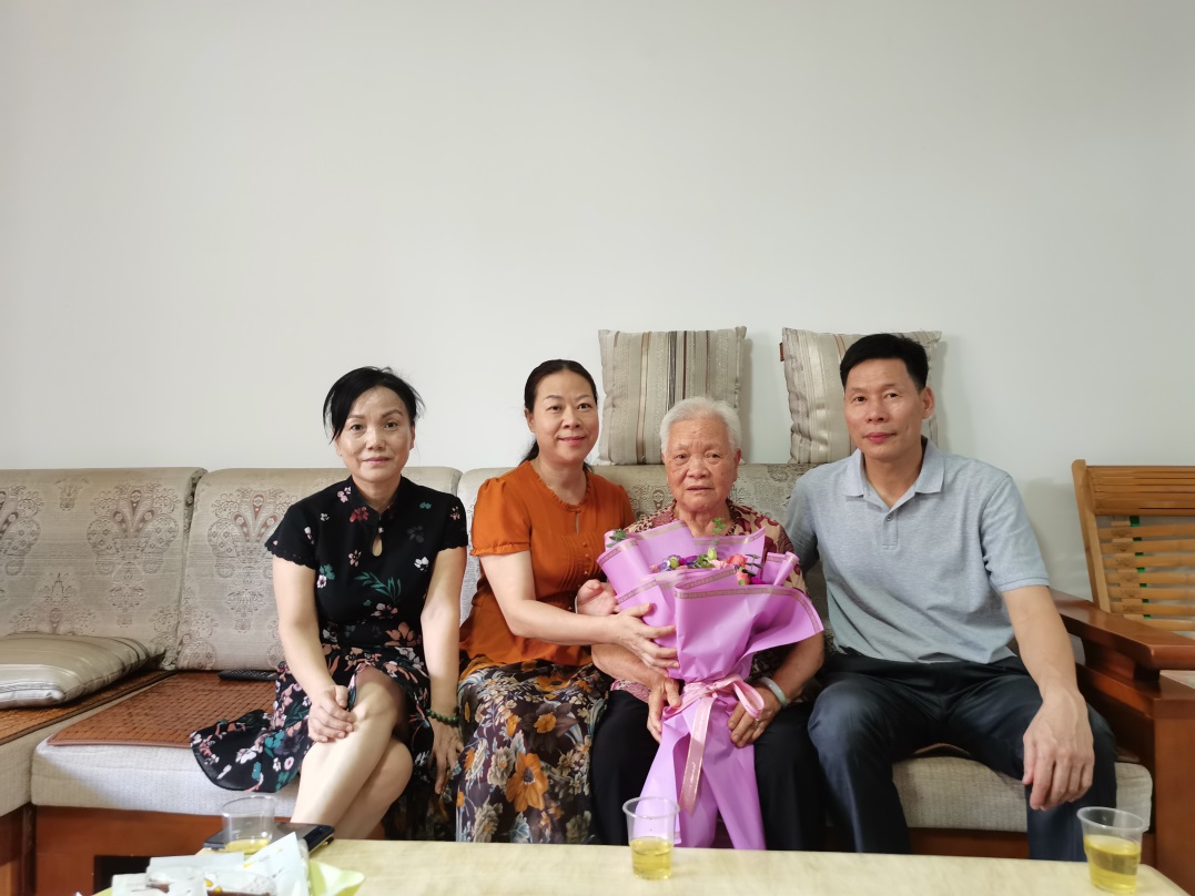 7月6日工会人员到86岁高龄的赖月桂家中看望,转达学校对她的关怀和问候,询问生活和身体情况,并送上鲜花和祝福。看她满头银发、精神闪烁、老有所医、老有所养的幸福生活,我们都很高兴,祝福她身体安康、快乐长寿。