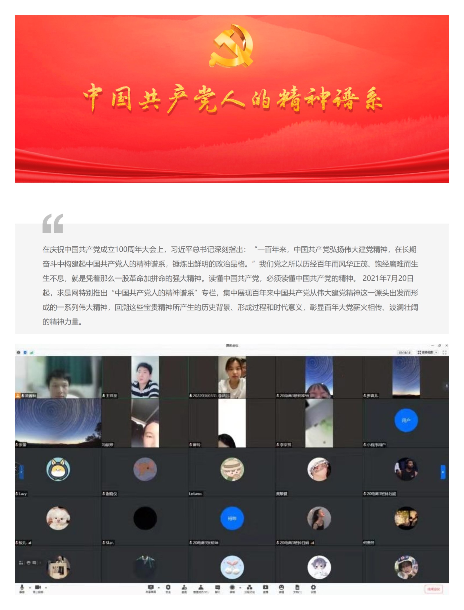 根据经贸学院党总支关于暑期党史学习教育的安排及要求,7月31日,经贸学院教工党员王祥至通过腾讯会议,为20级电子商务3班全体同学生动开讲了一堂题为“中国共产党人的精神谱系”的党课。