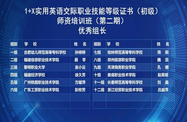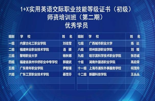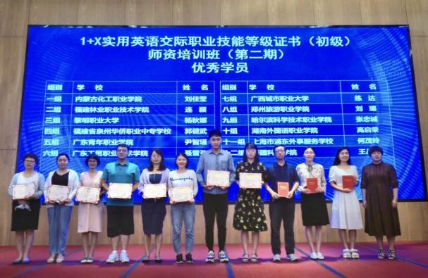 本次培训采取了过程性考核和结业测验相结合的评价模式,考核合格后颁发《1+X实用英语交际职业技能等级证书培训师证书》,并为选出优秀组长与优秀学员并颁奖。经过学习考核与测验评价,我院彭枚芳院长被选为优秀组长,聂雪芬老师被选为优秀学员。