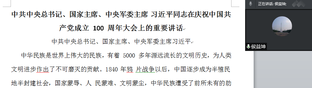 7月20日下午,党总支通过腾讯会议开展第一次党史学习教育专题学习,内容包括《习近平谈治国理政:人民是我们党执政的最大底气》、《习近平同志在庆祝中国共产党成立100周年大会上的重要讲话》、《中国共产党简史:五四运动和马克思主义在中国的传播》、《毛泽东邓小平江泽民胡锦涛关于中国共产党历史论述摘编:邓小平重要论述》,分别由党总支书记彭卫东、组织委员侯益坤、副书记欧敏和宣传委员陈锐钊带领学习。