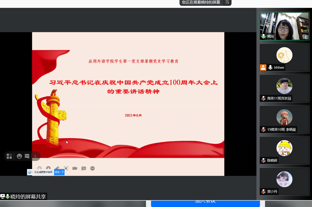 8月12日晚,应用外语学院学生第一党支部在线上开展暑期党史学习教育专题会,全体党员把学习贯彻习近平总书记“七一”重要讲话精神作为党史学习教育的核心内容,从学习中汲取智慧和力量,做到学史明理、学史增信、学史崇德、学史力行。支部书记陈晓玲老师、支委林耀佳老师、李迪老师,及支部学生党员参加了本次专题学习会,会议由陈晓玲主持。