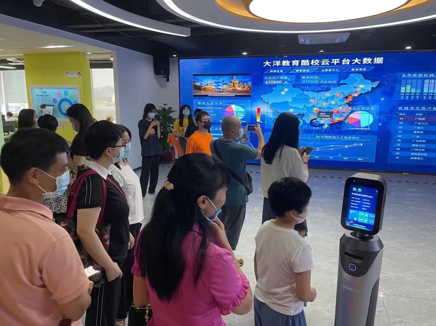 参访第一站——广州大洋教育科技股份有限公司,是一家集在线教育、软件研发、产学研合作、教育信息化、创业孵化服务为一体,旨在打造成为中国跨境电商“黄埔军校”的互联网教育科技企业。在听取其教育事业部总经理周黄宁的介绍后,参访团一行参观了大洋教育电子商务创新实训体验馆、大洋教育酷校云平台大数据中心,观摩了智慧教育产品的真实应用及效果,真切地感受到信息化在课程制作、资源平台、党建、AI技术等方面带来的改变,感受智能化教学设备和大数据中心带来的教学魅力。