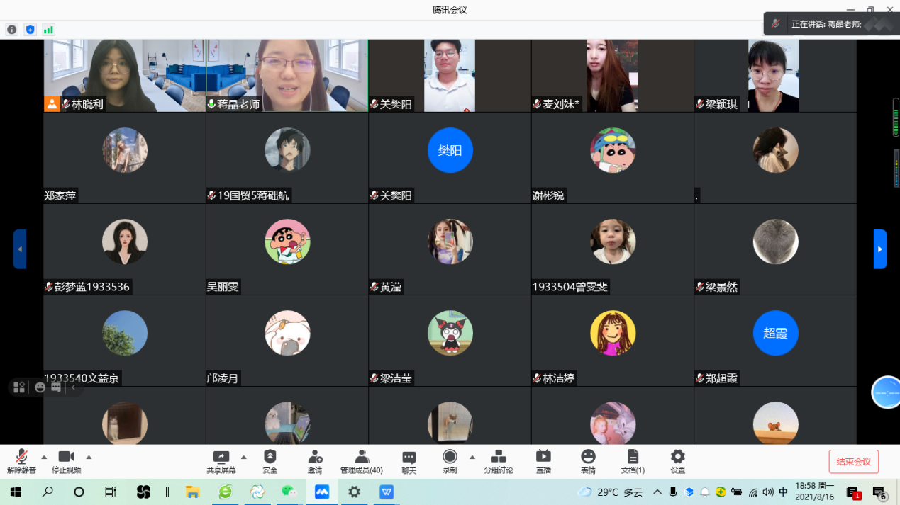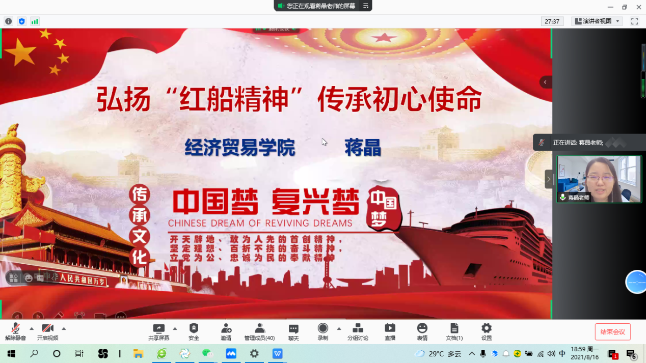 根据经贸学院党总支关于暑期党史学习教育的安排及要求,8月16日晚上7点,经贸学院副院长蒋晶老师通过腾讯会议,为19国贸5班全体同学讲授了“弘扬红船精神,传承初心使命”的专题党课。
