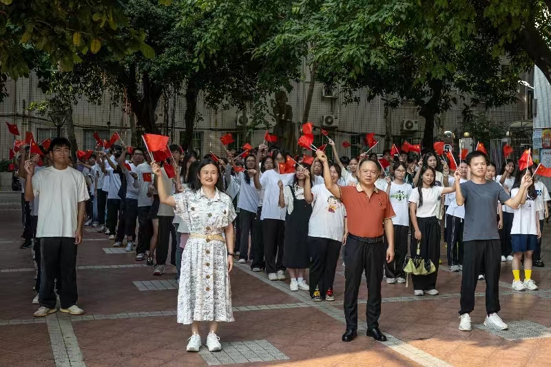 最后大家挥舞国旗,共同唱响《我和我的祖国》,升旗仪式在旋律优美、气势恢宏的歌曲声中结束。