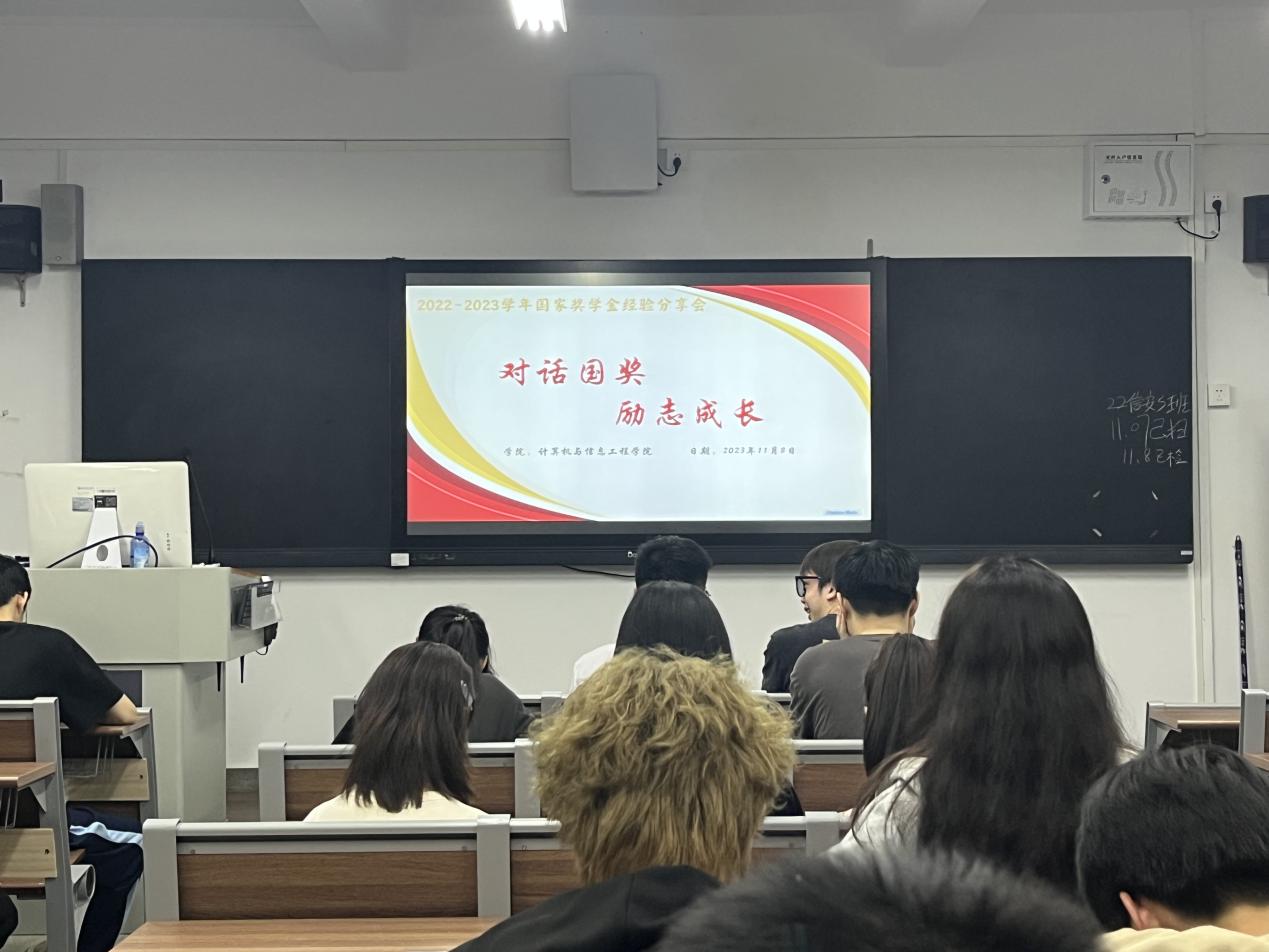 为进一步推进学校“一站式”学生社区综合管理模式建设工作,推动学业导师、成长导师、朋辈导生多支社区导师队伍下沉学生社区工作走深走实,为充分发挥优秀学生在学习科研、思想引领、社会实践等方面的榜样模范作用,协助学院开展朋辈导生计划,帮助学生尽快适应大学生活,做好大学生涯规划,计算机与信息工程学院于11月8日晚在教学楼303开展“对话国奖,励志成长”国家奖学金经验分享交流会。