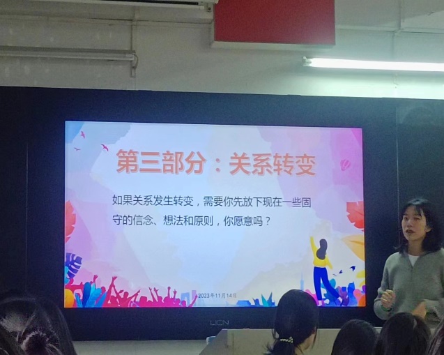 第三部分为此活动的最后一个部分——关系转变。每段关系里面多多少少都会遇到矛盾和冲突。张静老师通过提问“如果关系发生转变,需要你先放下现在一些固守的信念、想法和原则,你愿意吗?”引导学生们进行讨论。