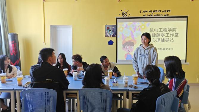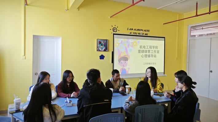机电工程学院壹肆肆零工作室——心理辅导站于2023年11月19日15点在学生宿舍16楼举行2023年度工作部署交流会,心理辅导站指导老师惠梦梦及全体成员参加会议,本次会议旨在部署各部门工作,尽快明确自身职责,并制定新学年工作计划和活动安排。