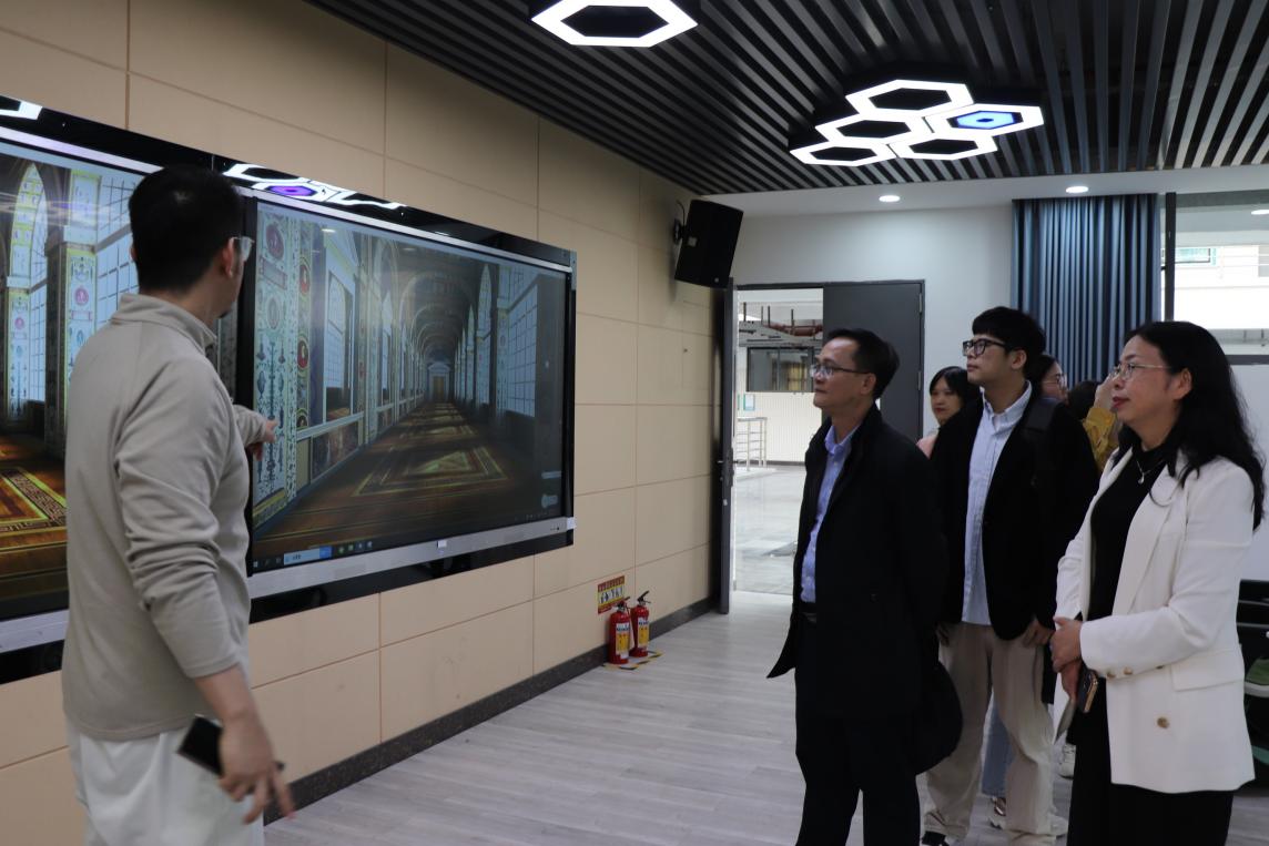 座谈会结束后,广西国际商务职业技术学院的交流人员在彭枚芳院长的陪同下参观了学院中外文化虚拟情景交流中心和智能翻译培训中心等专业实训室,黄忠电对我院专业建设取得的成就表示赞赏,并对我院的热情接待表示忠诚感谢。