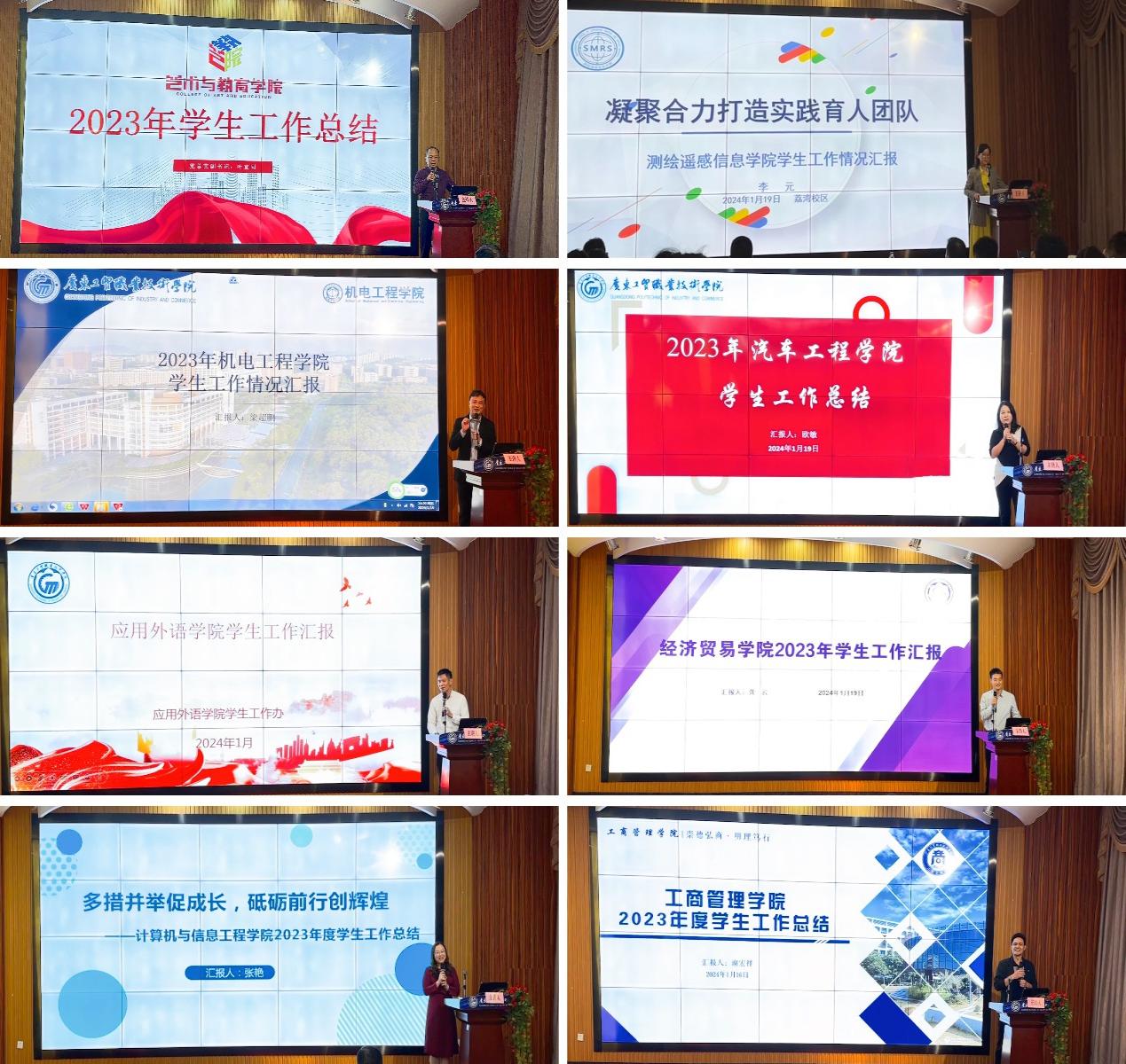 会议伊始,由艺术与教育学院党总支临时负责人叶宜同致词。学生工作处处长刘建军、校团委书记陈冠锋和创新创业学院副院长王坤明站在分管的角度,立足工作内涵,对2023年学生工作总结进行了汇报,并提出2024年度学生工作总体思路及全面部署。各学院副书记围绕学院学生工作亮点、创新、成效、存在的问题、措施及展望进行了汇报。充分展示了学工队伍在学生就业、征兵、学生心理健康、生涯规划、挑战杯、三下乡、校园文化、社团活动、志愿服务、校企合作和学业辅导等方面做出的显著成效。