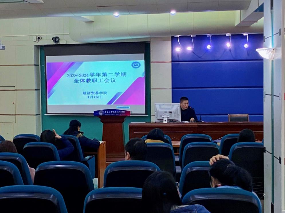 律转鸿钧、四序递迁,甲辰新景、梦想无垠。为认真学习贯彻习近平新时代中国特色社会主义思想,坚定不移走好高质量发展之路,推进经贸学院各项工作取得新的突破,2月25日上午,经济贸易学院2023-2024学年第二学期全体教职工大会在天河校区西区综合楼5楼报告厅召开,学校党委委员、副校长唐毓秋及经贸学院全体教职工出席会议。会议由经贸学院党总支书记李繁主持。