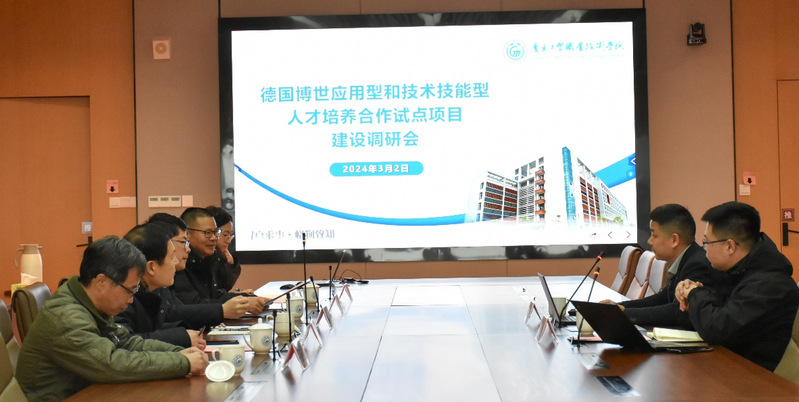 3月2日下午,德国博世应用型和技术技能型人才培养合作试点项目组专家潘涛、杨金、刘丽(线上)到威尼斯官网开展试点项目建设调研。学校党委委员、副校长徐勇军出席调研会,机电工程学院临时负责人罗庚兴、教务处副处长赵俊峰等领导和老师参会,调研会议由机电工程学院临时负责人罗庚兴主持。