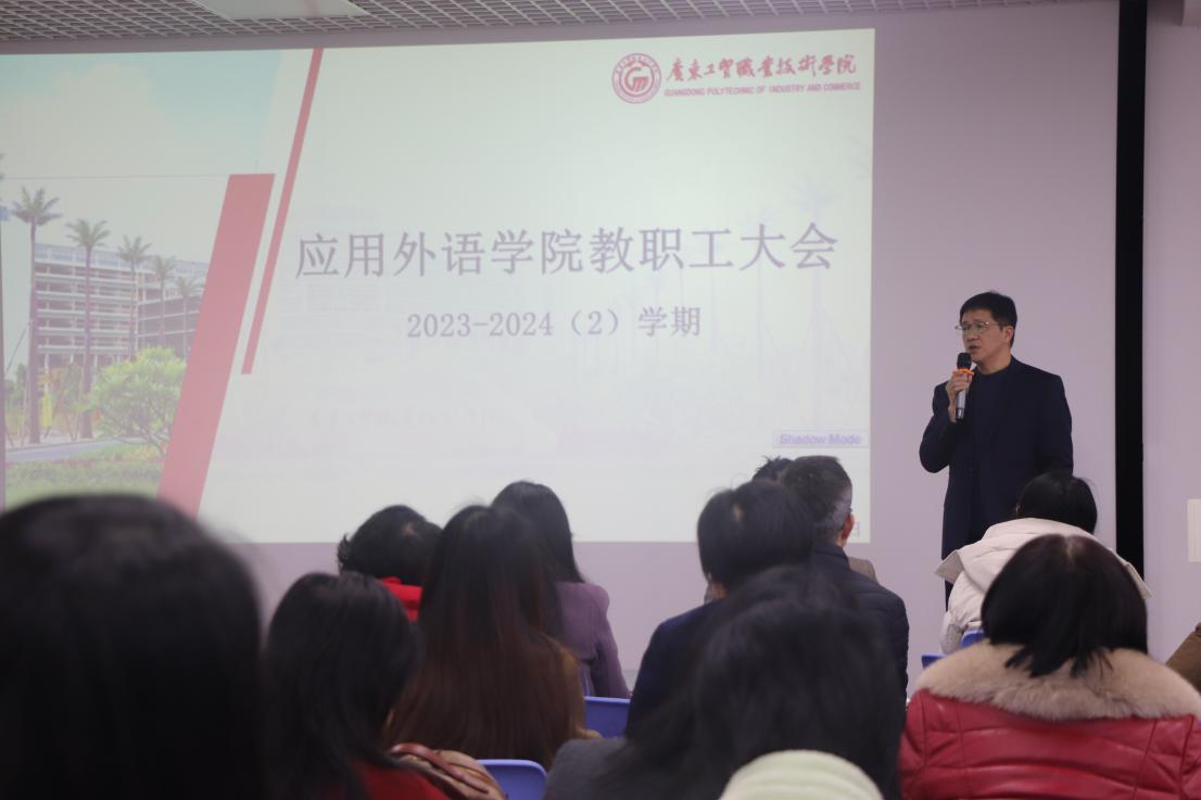 会上,刘贻新肯定应用外语学院在过去一年取得的成绩,并传达了广东省教育高质量发展大会的会议精神,扎实推进“双高计划”建设,促进学校教育事业发展。同时刘贻新对各位老师提出三点希望:一是希望大家主动谋划,精准发力。面对大环境的激烈竞争和国家对教育改革的迫切背景,各位老师在思考教学问题的同时也要落实到中微观的行动当中。二是希望大家强化内功,精诚合作。随着就业市场对学生能力要求的不断提高,各位老师需要不断提升自身能力、视野和格局,抓好师德师风,通过不同渠道提升自己。同时要找到工作中的家,和学校的家人们共同发挥本领。三是希望大家快乐工作,精神饱满。将工作当做事业来做,珍惜工作的缘分,各位老师的心情也会随之舒畅。日常生活中大家要注意劳逸结合,加强锻炼,方可展现良好的精神面貌。