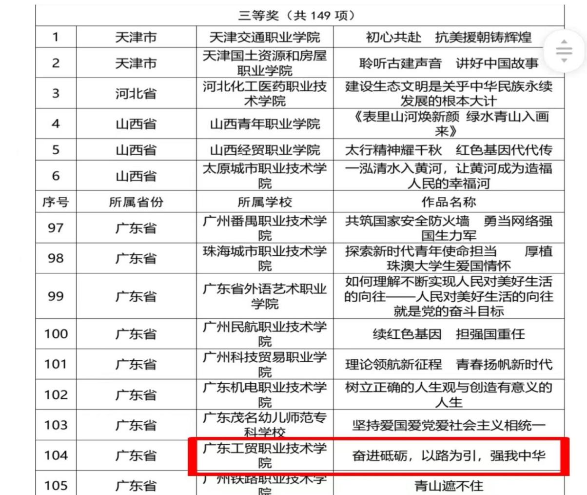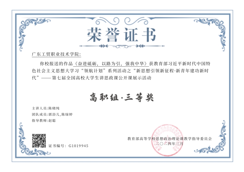 近日,由教育部社会科学司指导、教育部高校思政课教学指导委员会主办的“新思想引领新征程·新青年建功新时代”第七届全国大学生讲思政课公开课展示活动获奖名单公布。威尼斯官网学生参赛作品《奋进砥砺·以路为引·强我中华》在全国评选中脱颖而出,荣获全国高职组三等奖。