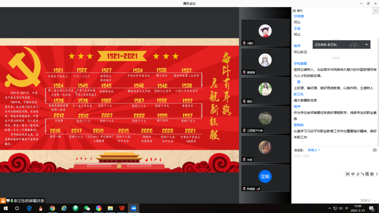 3月15日下午,汽车工程学院通过腾讯会议软件开展党总支书记讲党课活动。汽车工程学院党总支书记彭卫东以“中国共产党百年奋斗历程”为题,为全体教职工送上了一堂精彩的党课,汽车工程学院全体教职工参加了党课。 党总支书记彭卫东阐述中国共产党发展历史 党总支书记彭卫东以时间为轴,带领全体教师回顾了中国共产党自1921年建党以来的百年奋斗历史,从开天辟地的“新民主主义革命时期”、改天换地的“社会主义革命和建设时期”、翻天覆地的“改革开放和社会主义现代化建设新时期”和惊天动地的“新时代中国特色社会主义时期”四个方面系统阐述了中国共产党的发展历程。 最后,彭卫东指出,中国共产党的历史本身就是一部具有丰富内容的教科书,作为一名高校教师党员,我们要认真学习党的历史,继承和发扬光大革命传统和党的优良作风,学史明理、学史增信、学史崇德、学史力行,以昂扬姿态奋力开启全面建设社会主义现代化国家新征程。 (汽车工程学院 文/图 陈锐钊 编辑/陈锐钊 审核/彭卫东) |